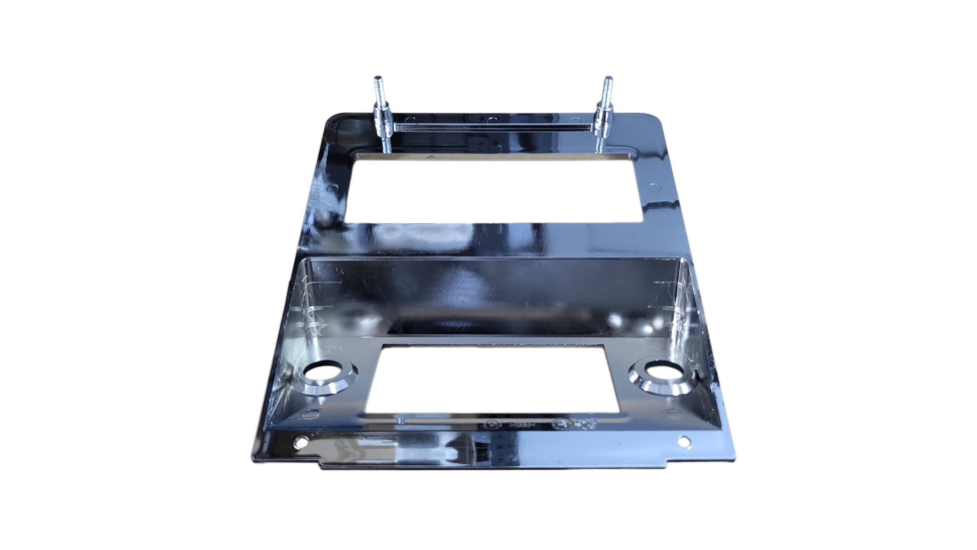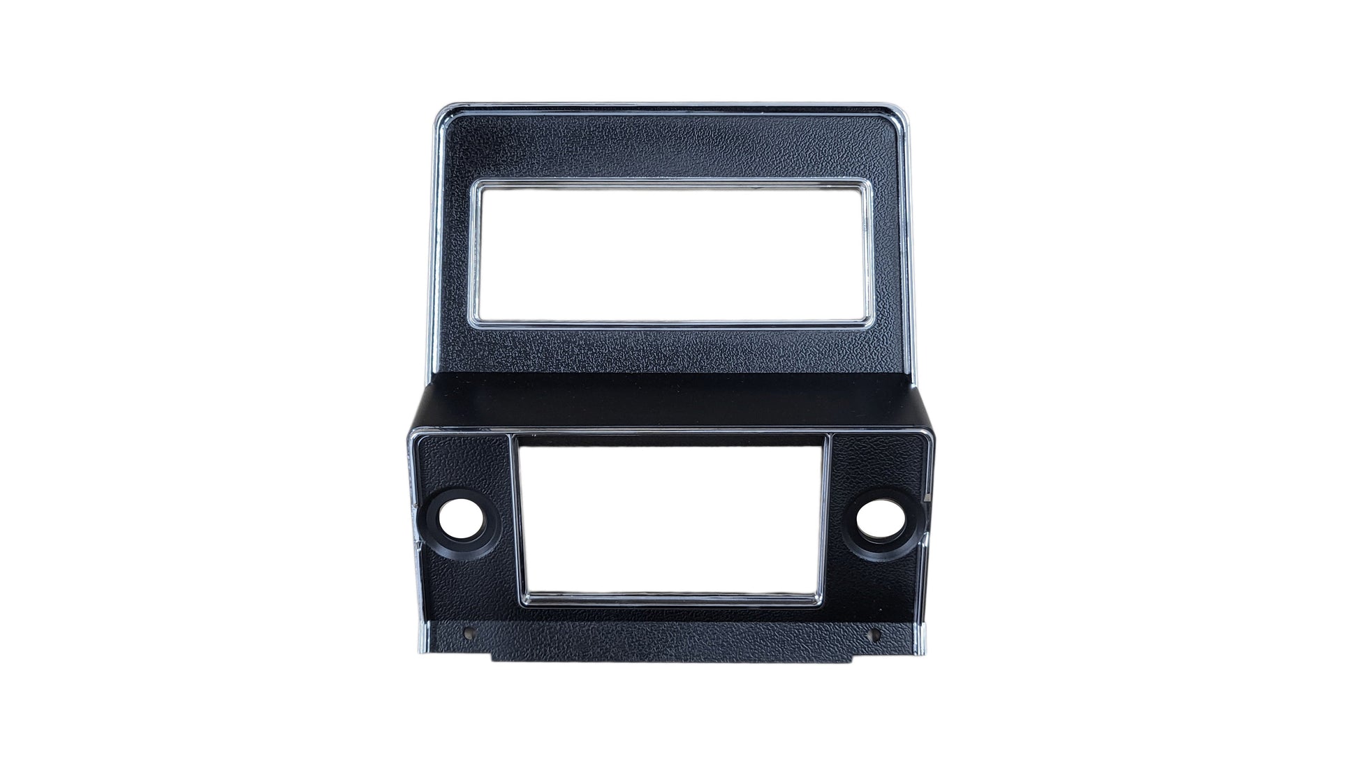 New reproduction 1969-70 Ford Mustang and Cougar dash radio bezel in black. Made like originals with plastic injection-mold tooling in ABS plastic. Features correct textured black finish and chrome bezel edges.