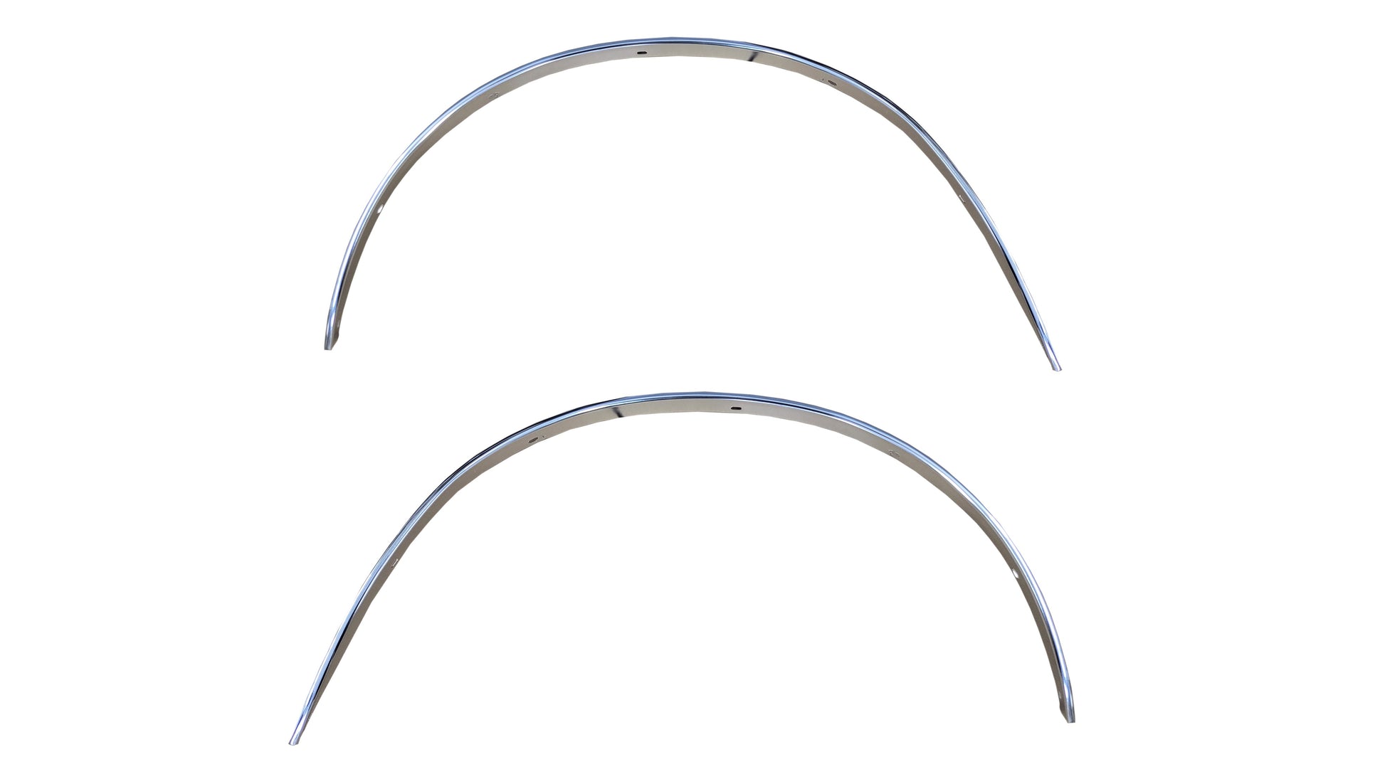 New reproduction driver and passenger side front wheel opening moldings for 1965-66 Ford Mustangs. Made like original using roll-formed aluminum and a bright polished finish like original to fit onto the front passenger and driver side fenders above the wheel. Made to original specifications for an easy and seamless installation.