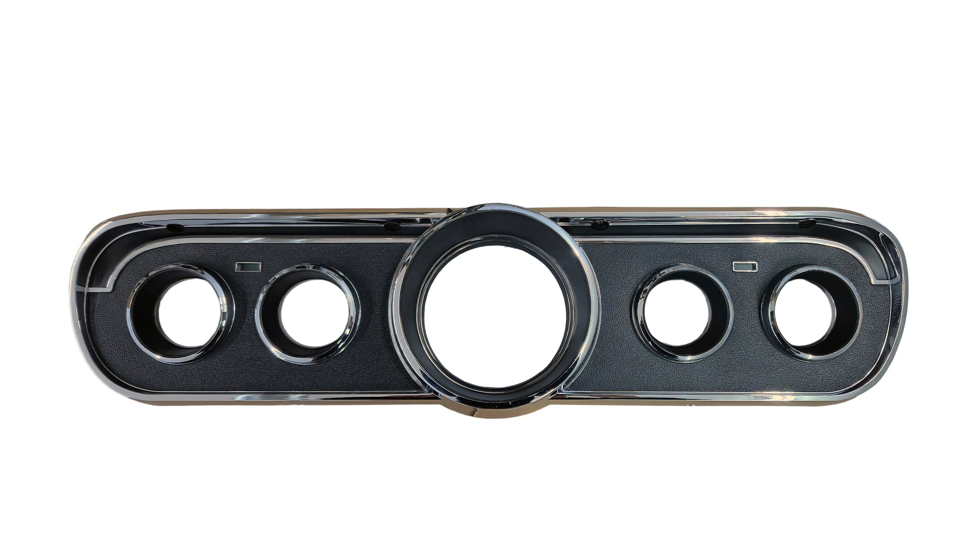 New reproduction instrument cluster gauge bezel for 1965-66 Ford Mustangs and Mustang GTs. This gauge bezel is made using plastic injection tooling and finished with correct chroming and pebble-grain textured black gauge face. The bezel comes with the light indicator lenses pre-installed.