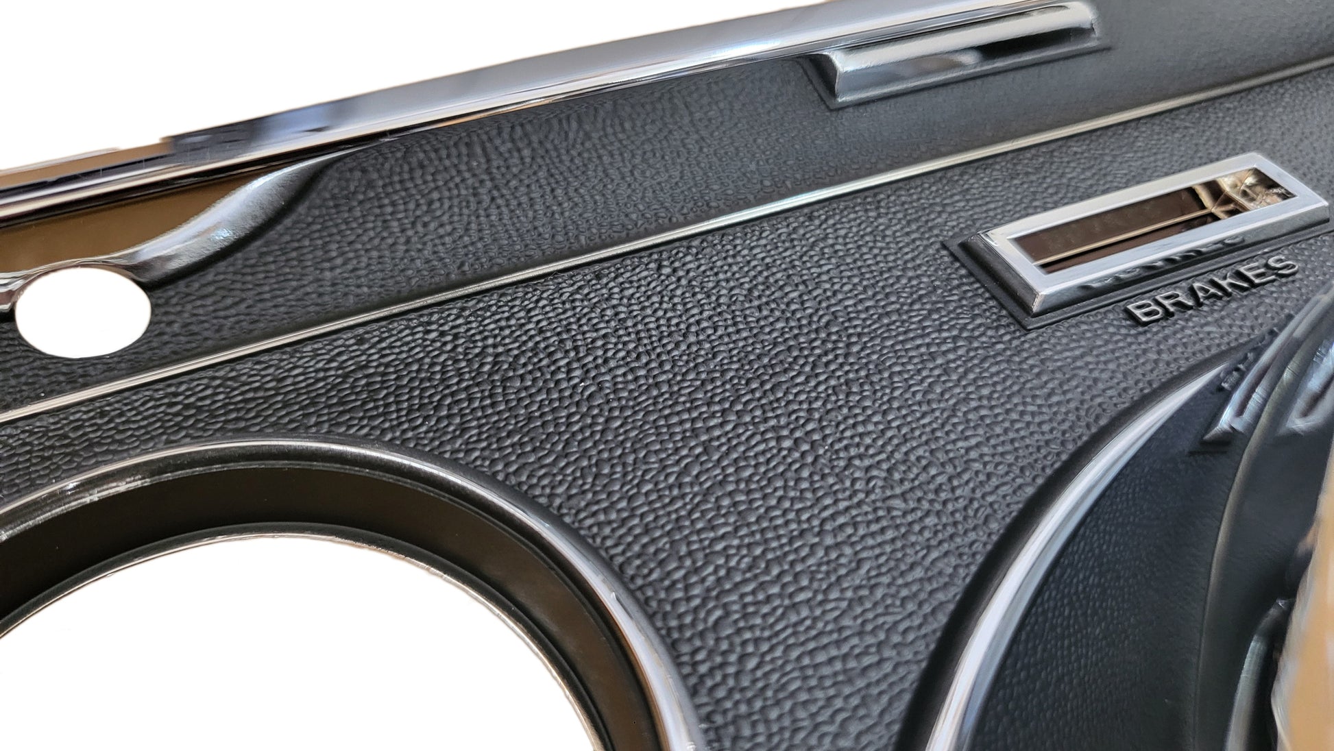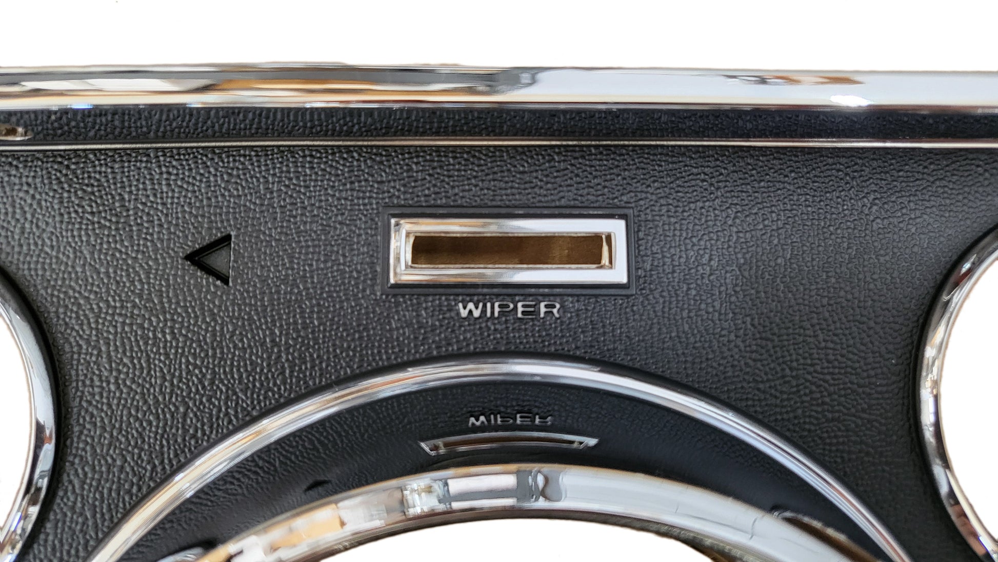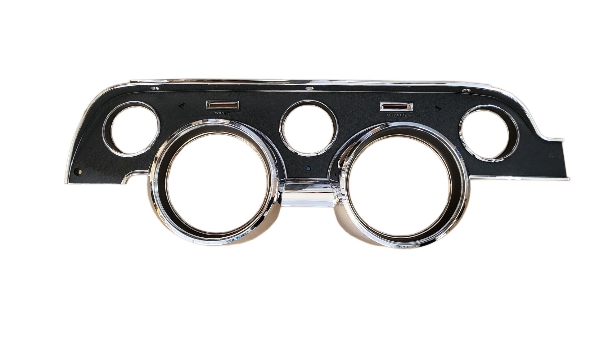 New reproduction instrument cluster gauge bezel for 1967 Ford Mustangs. This gauge bezel is made using plastic injection tooling and finished with correct chroming and pebble-grain textured black gauge face. The bezel comes with the light indicator lenses pre-installed.