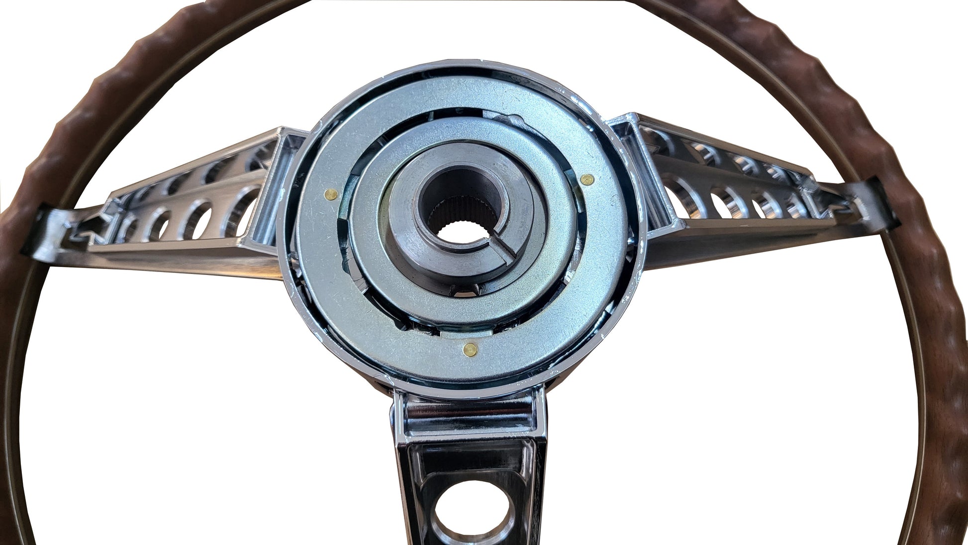 New reproduction deluxe woodgrain steering wheel for 1967 Ford Mustangs. This wheel comes finished in a beautiful woodgrain with a "rivet-style" look and spokes finished in brushed metal for an original look and feel. This wheel comes with the horn contact installed, but does not come with the horn button.
