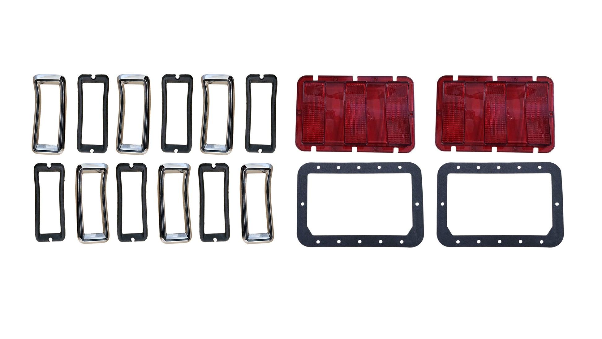 New reproduction tail light bezels and lens kit for 1968 Ford Mustangs. This kit comes with the tail light lenses and a set of 6 tail light bezels. Kit comes with gaskets for the lenses and bezels. This kit comes with the 1968 year correct tail light bezels which black accents.